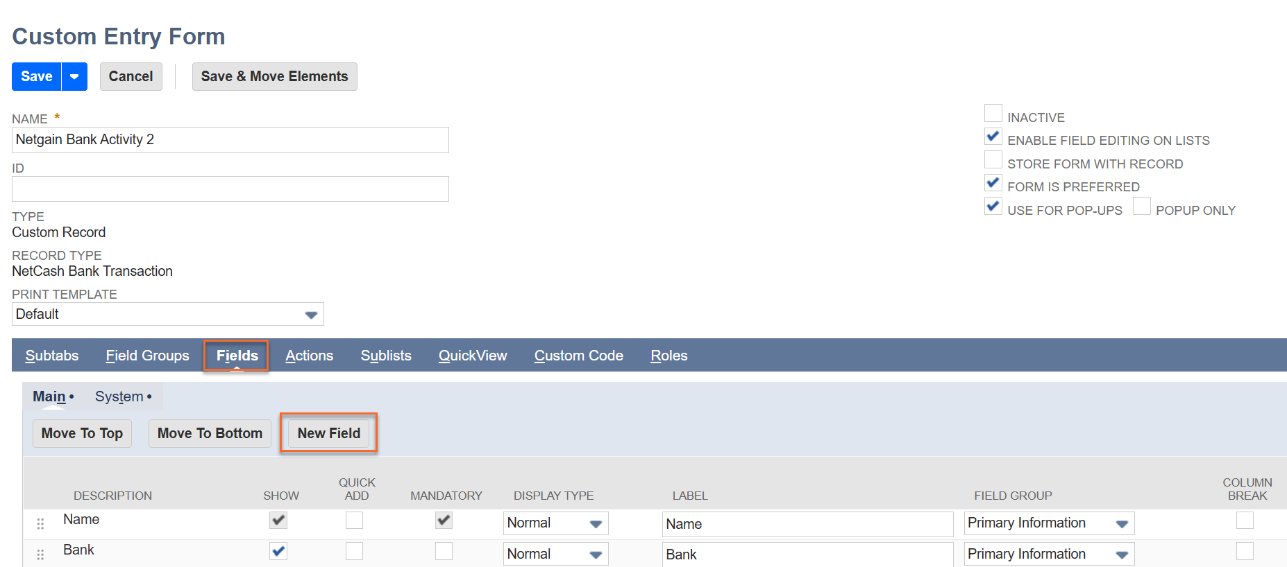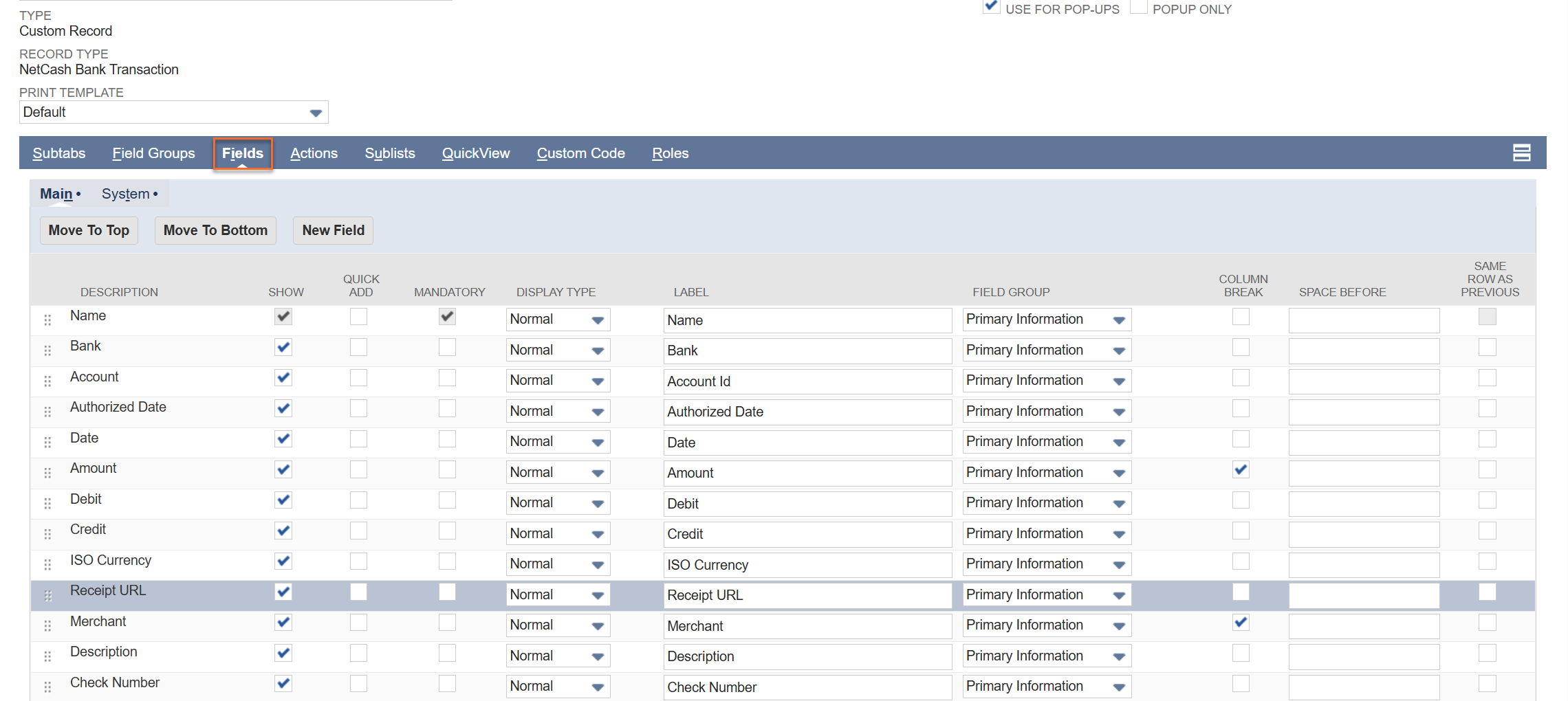 Back on the form, go to "Fields" and move the new field to where you would like it to appear on the Bank Transaction record.