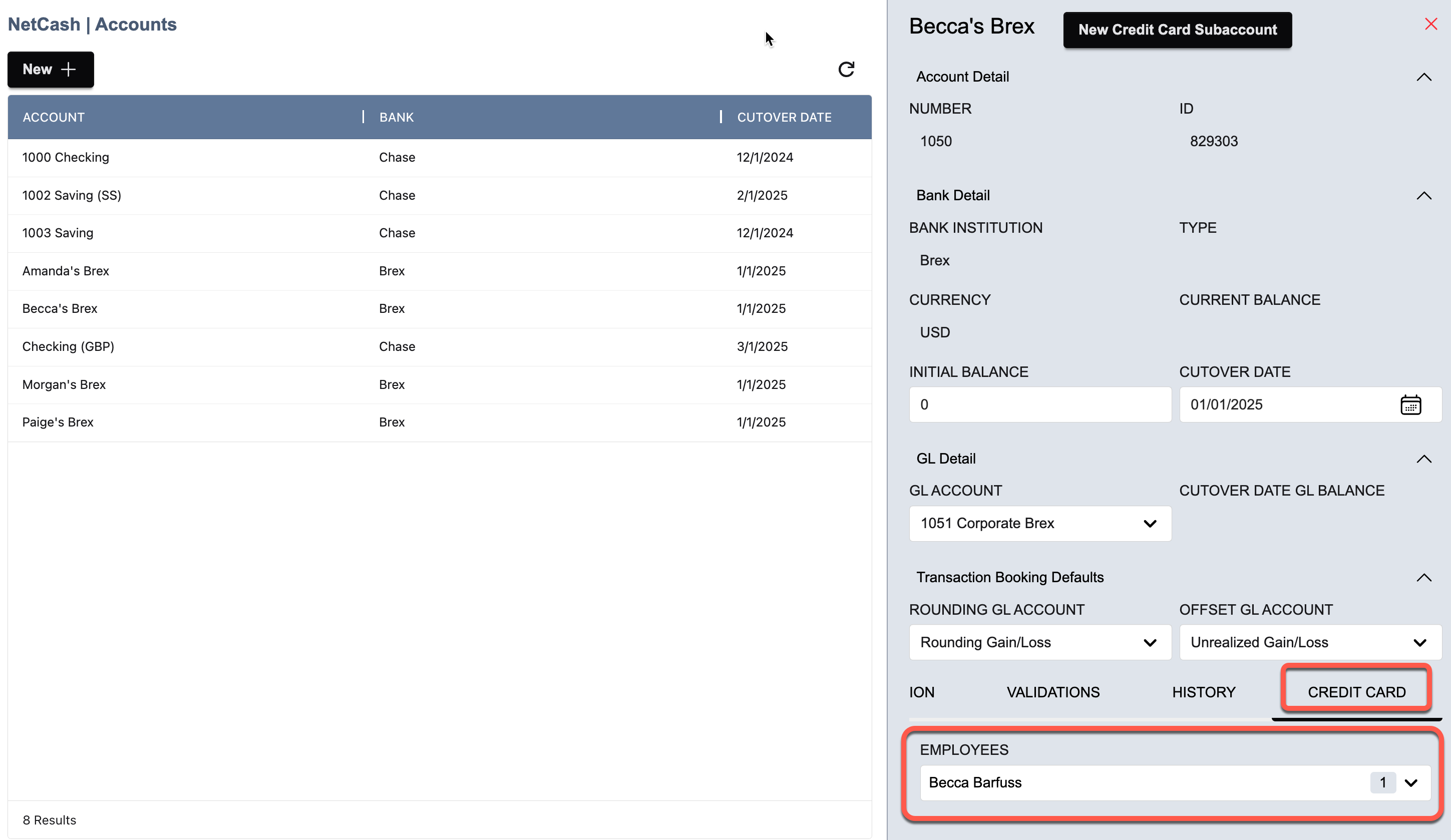 Like Bank Accounts, Credit Card Accounts can have transactions created through available API connections or through CSV imports. If the Credit Card is through an API connection, this article will walk you through the connection process. If using CSV imports, the Credit Card Accounts are manually created the same way you create Bank Accounts in NetCash as outlined here. You will first create a record for the Credit Card Institution and then each individual Credit Card Account. In NetCash, Credit Card and Bank Accounts are both referred to as "NetCash Bank Accounts." NetCash determines if an account is a bank or credit card account based on the GL Account that is mapped to the NetCash Bank Account. If a GL Account with the Account Type Credit Card is mapped to a NetCash Bank Account it will be treated as a Credit Card Account. Similar to Bank Accounts, Credit Card accounts can be created with a Custom Record CSV import.