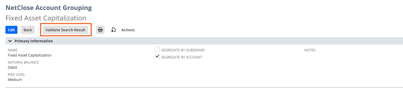 Once your saved search is linked to your NetClose account grouping record, you can verify it by clicking the Validate Search Result button on the NetClose account grouping. This button initiates a script that reads your saved search and retrieves the balance for the current period. If the search has been linked correctly and field IDs are accurate, the system will display a value, as shown below.