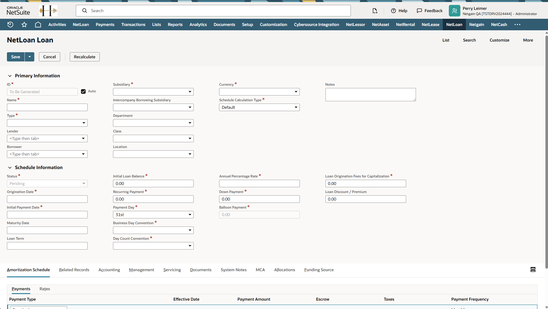 - A blank, new NetLoan Loan Form appears, from which you can create a new loan
