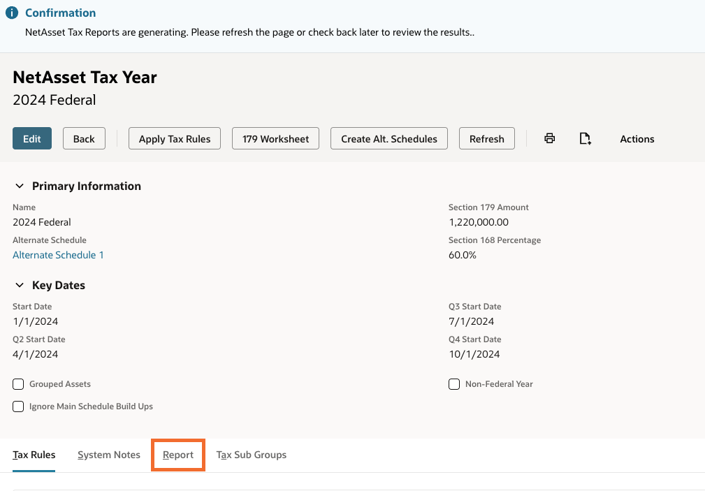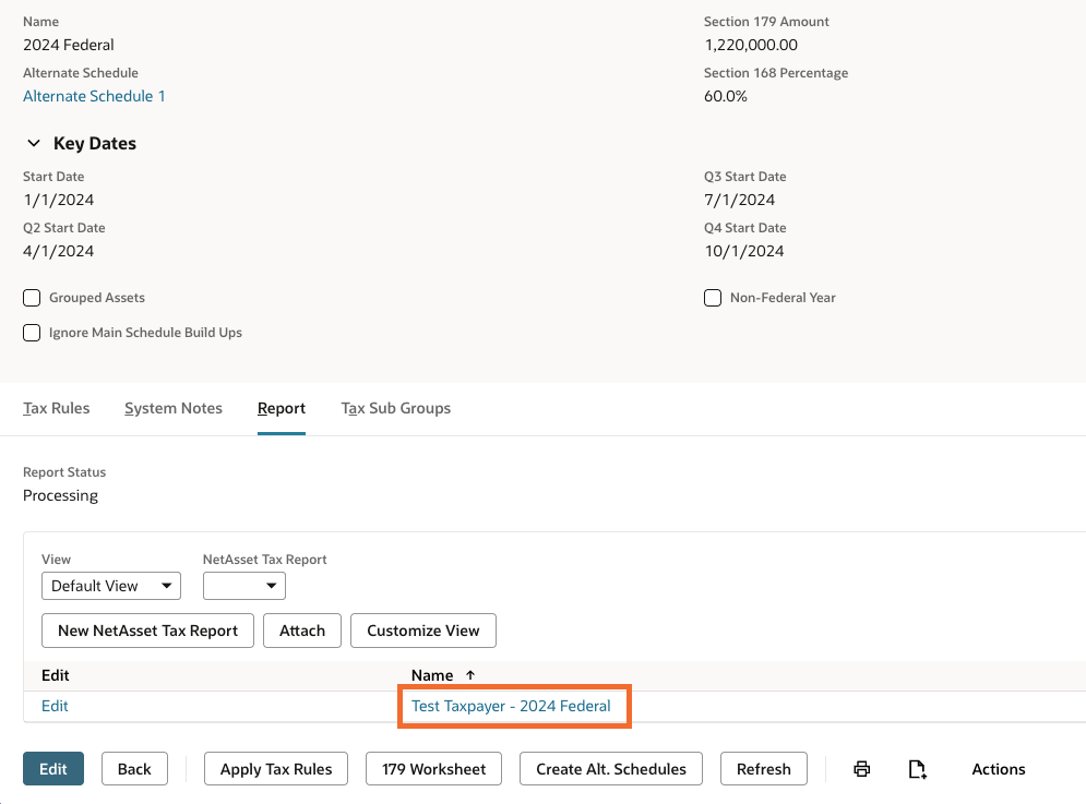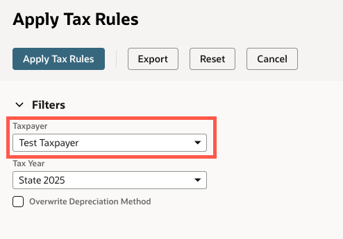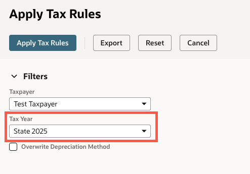Apply rules per Taxpayer per Tax Year. This populates depreciation methods, lives, conventions, and Section 168/179 based on asset type and tax classification. Refer to the NetAsset - Tax Engine: Apply Tax Rules guide for detailed instructions.