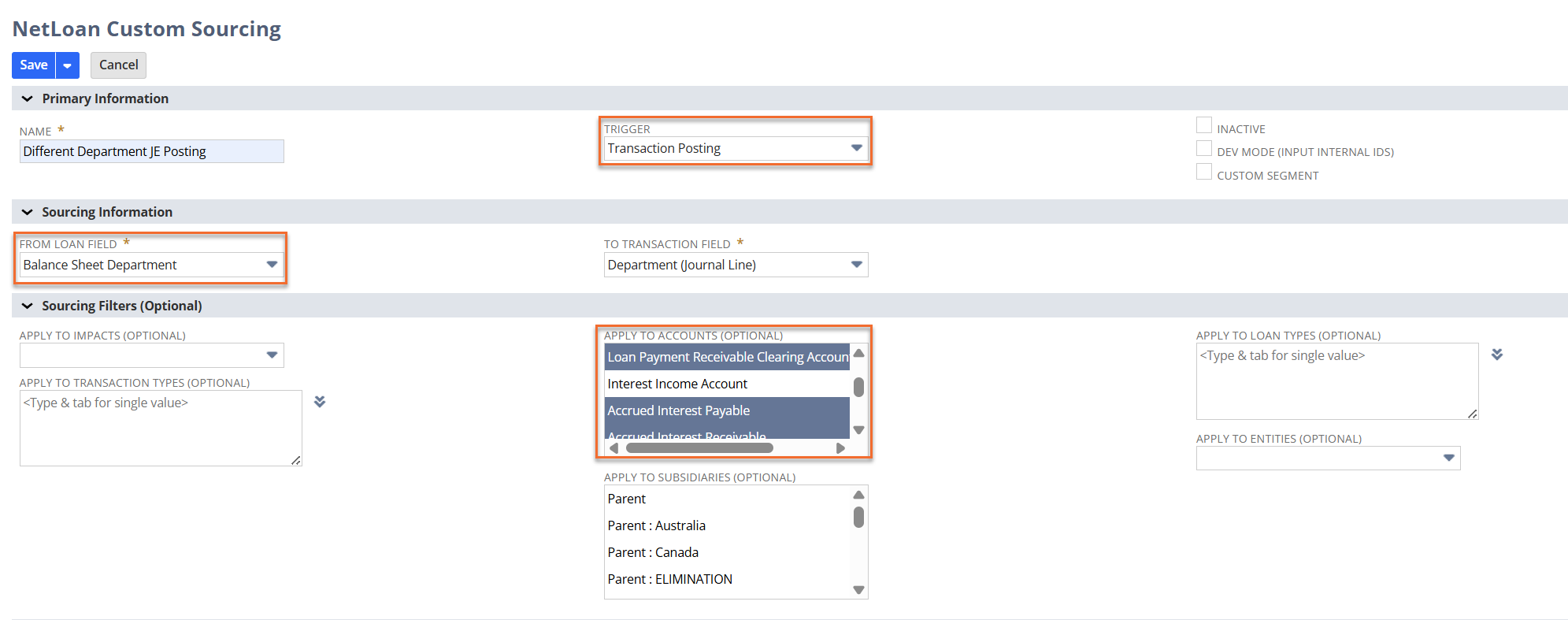 2. Create a new Custom Sourcing rule using the Transaction Posting trigger. Make sure to specify the accounts the rule should apply to in the Sourcing Filters section; otherwise, it will update the segment on all journal lines. When setting up the rule, select the new field you created on the NetLoan Loan record as the source field.