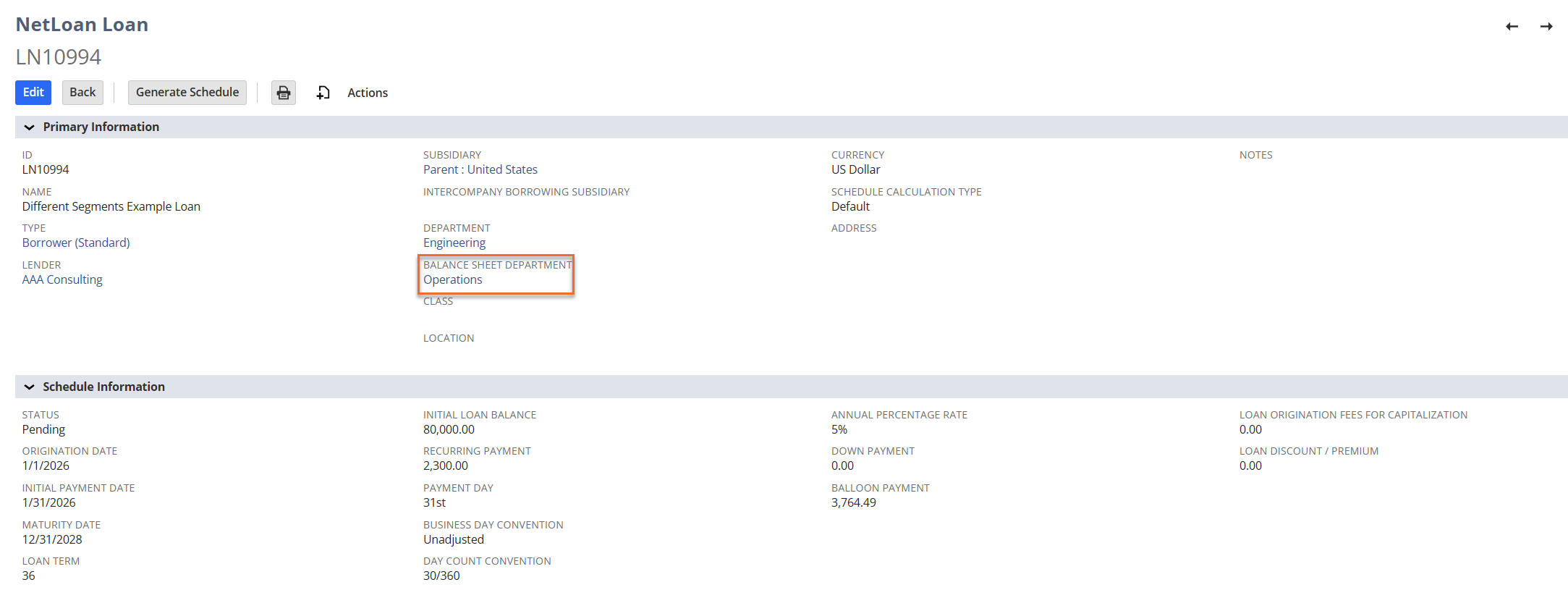 NetLoan - Use a Different Segment for Balance Sheet or P&L Accounts
